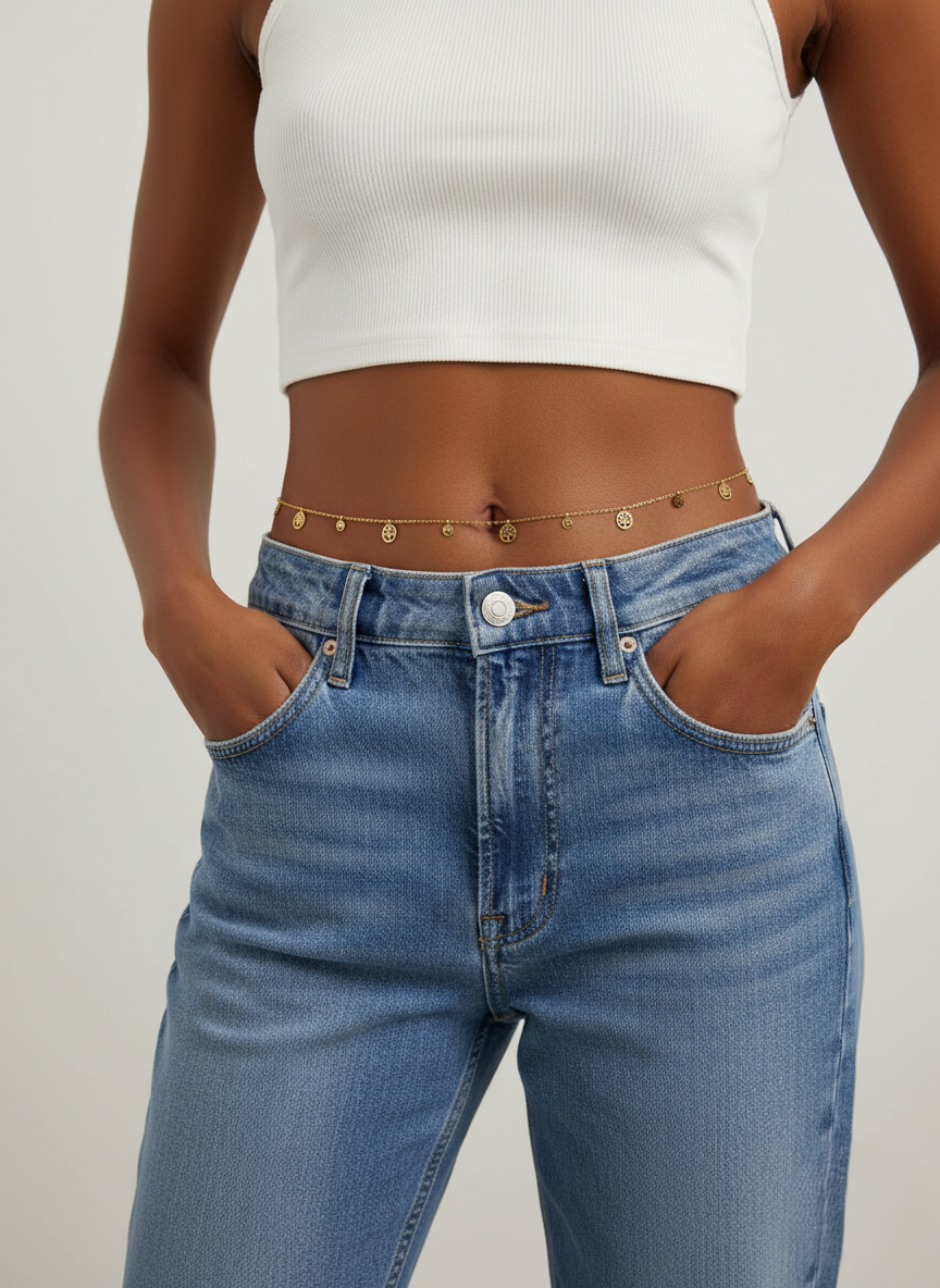 A timeless waist chain made from stainless steel with a premium PVD gold coating, accented with classic coin charms for an elegant statement.