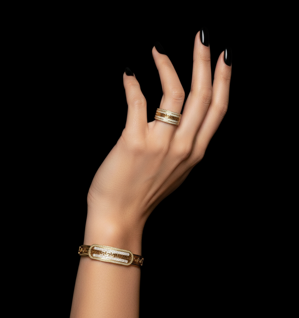 Enhance your look with this elegant Greek Key stainless steel bangle, designed to reflect timeless luxury and modern sophistication. The refined gold-tone finish and intricate detailing make it a perfect statement piece for both everyday elegance and special occasions.