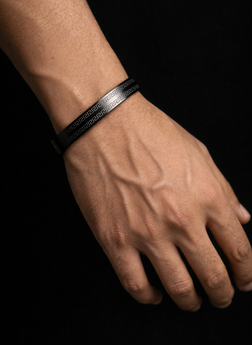 A sleek black cuff featuring a subtle Greek key engraving. A modern symbol of strength and timeless design.