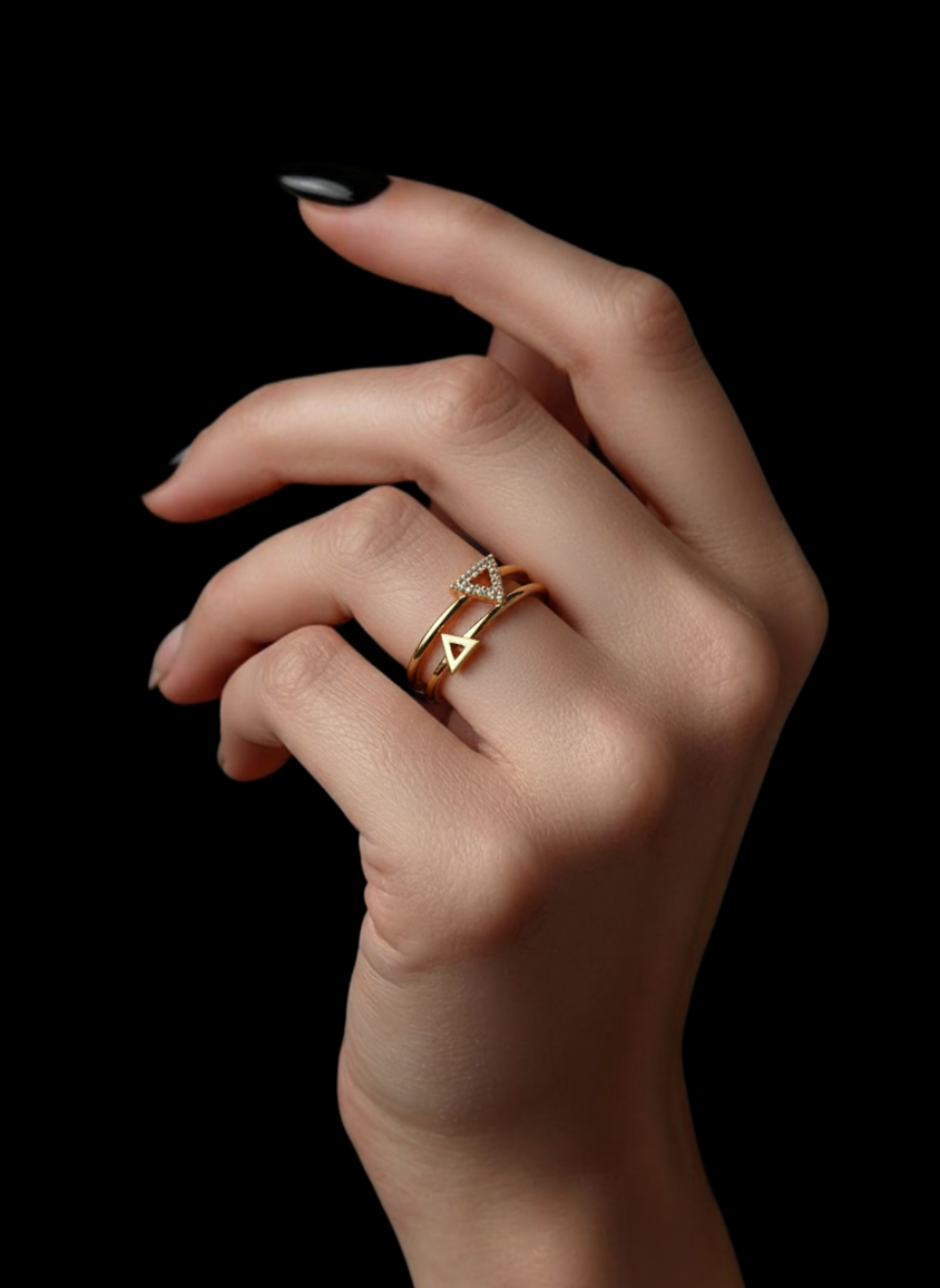 Modern and elegant, the Trinity Sparkle Adjustable Ring features a sleek gold-tone band with delicate triangle accents for a chic geometric statement.