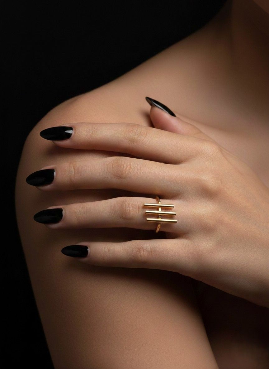 A bold yet minimal triple-bar ring designed for effortless everyday elegance. Its sleek gold-tone finish makes it a perfect statement piece, whether worn solo or stacked.